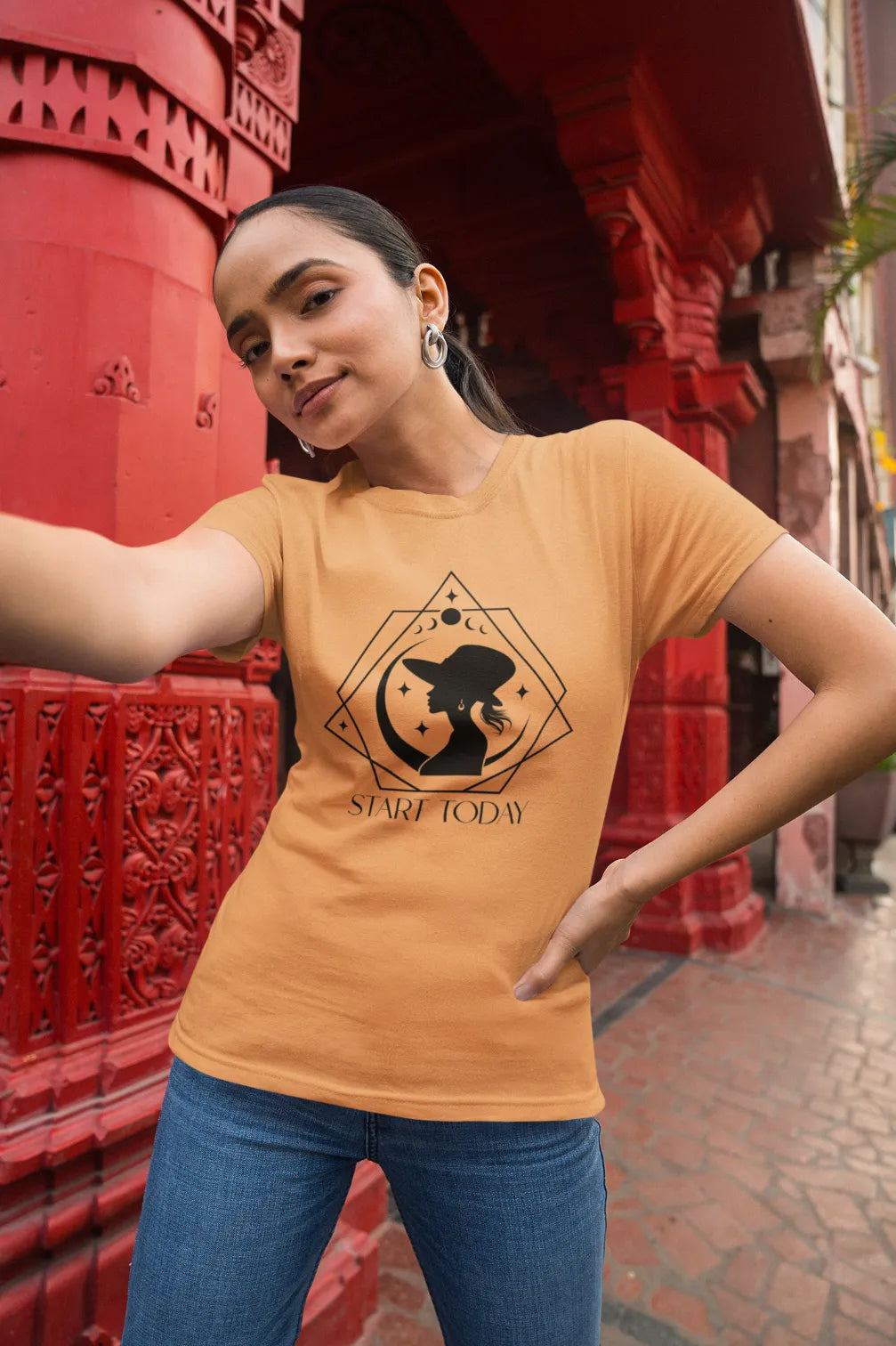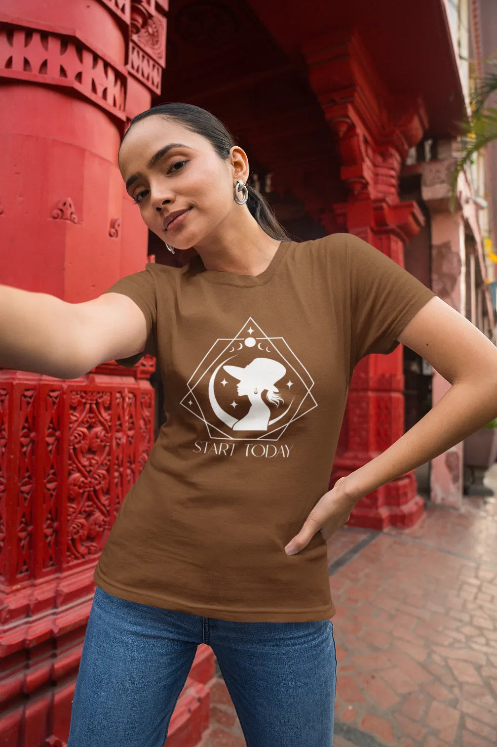 Designed for women who love slow fashion, earthy tones, and mindful living, this tee pairs effortlessly with your favorite denims, flared pants, or even barefoot mornings on the balcony.